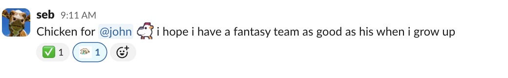Teammates can thank each other in Slack by sending chickens 🐔🐔🐔🐔. It's quick, fun, and meaningful.